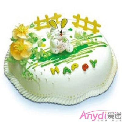 【材    料】圆形鲜奶蛋糕,绿草、花朵装饰,蛋糕上做一只兔。