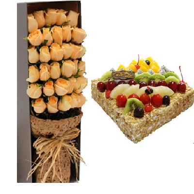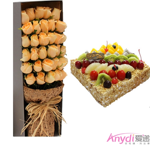 [材 料]:33枝香槟玫瑰+10寸方形水果蛋糕