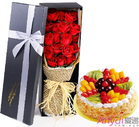 [材 料]:19枝红玫瑰+10寸水果蛋糕