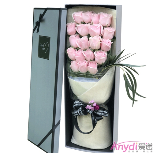 【材 料】:精选19枝粉雪山玫瑰(每排按4枝摆放)。尤加利绿叶如图装饰。