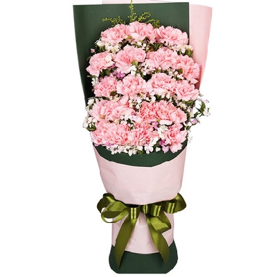 【材 料】:精选19朵粉色康乃馨,搭配相思梅、黄莺丰满。