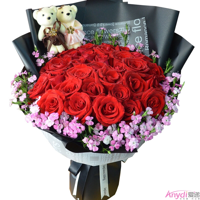 【材 料】:精选33朵昆明红玫瑰。相思梅外围。+2只小熊