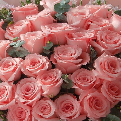 【材料】:戴安娜玫瑰33枝、粉色美女樱10枝、尤加利10枝。