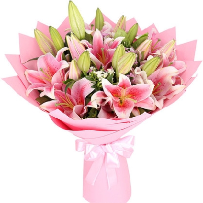 【材 料】:精选7枝多头粉百合,黄莺、栀子叶、相思梅点缀。+98g德芙巧克力一盒。